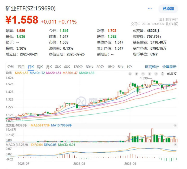 9月26日,矿业有色逆势飙涨。截至10时18分,表征板块的矿业ETF(159690)放量大涨,一度涨2.52%,资金净流入、净值攀升态势显著,年内规模增长352.69%。成分股中,湖南白银、白银有色等股涨幅居前,成为推动指数上行的核心动力。同期,伦敦现货白银价格突破42美元/盎司,创14年新高,沪银期货主力合约亦突破1万元/千克关口。