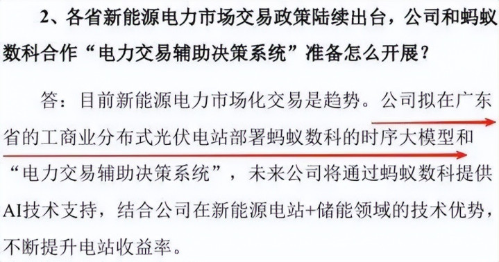 目前新能源电力市场化交易是趋势。能辉科技拟在广东省的工商业分布式光伏电站部署蚂蚁数科的时序大模型和“电力交易辅助决策系统”,未来公司将通过蚂蚁数科提供AI技术支持,结合公司在新能源电站+储能领域的技术优势,不断提升电站收益率。
