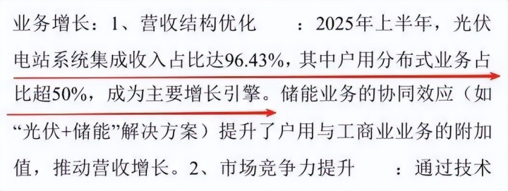 在营收结构上,2025年上半年,光伏电站系统集成收入占比达96.43%,其中户用分布式业务占比超50%,成为主要增长引擎。